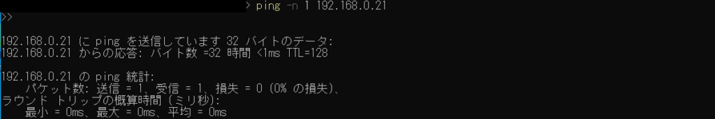 見慣れた疎通確認の画面ですが、たくさんのPCへの疎通確認が必要な時などは、Pingの後ろに-n 1を入れることでPingの送信を一度で終わらせることができます。